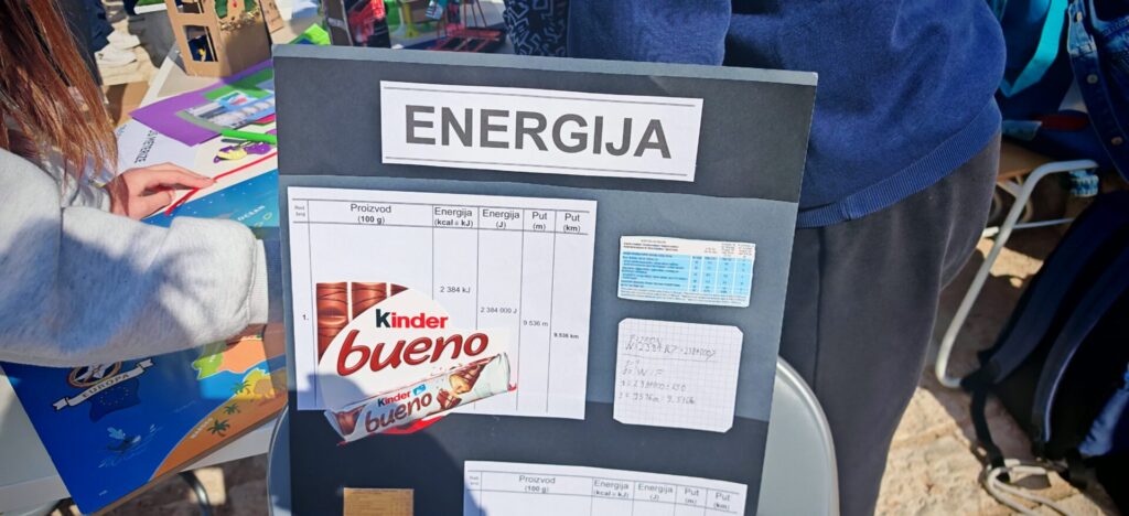 Gabriela Perković i Paola Piližota iz 7.a razreda te Luka Pilić i Daniel Roško iz 7.b razreda, zajedno sa svojim profesoricama i mentoricama – Ivonom Matejčić iz Fizike i Ivanom Jurica iz Geografije – pokazali su i predstavili svoji rad. Rad je nosio naslov „Od čokolade do nebodera“, a kako je tema ovogodišnjeg Festivala znanosti bila energija, naši su učenici zajedno s mentoricama pripremili zanimljiv i edukativan projekt.