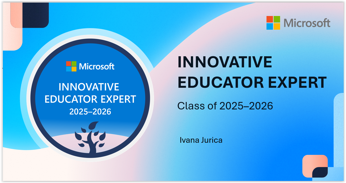 I ove školske godine naša učiteljica geografije Ivana Jurica može se pohvaliti titulom MIE Experta. Priznanje, punog naziva Microsoft Innovative Educator Expert, je priznanje kojim Microsoft valorizira i procjenjuje rad prijavljenih učitelja diljem svijeta. Izabiru učitelje koji koristeći Microsoftove digitalne alate transformiraju poučavanje i učenje putem tehnologije stvarajući na taj način okruženje za učenje usmjereno na učenike.