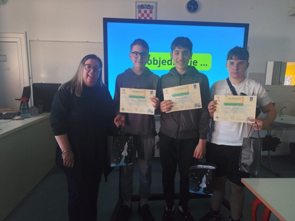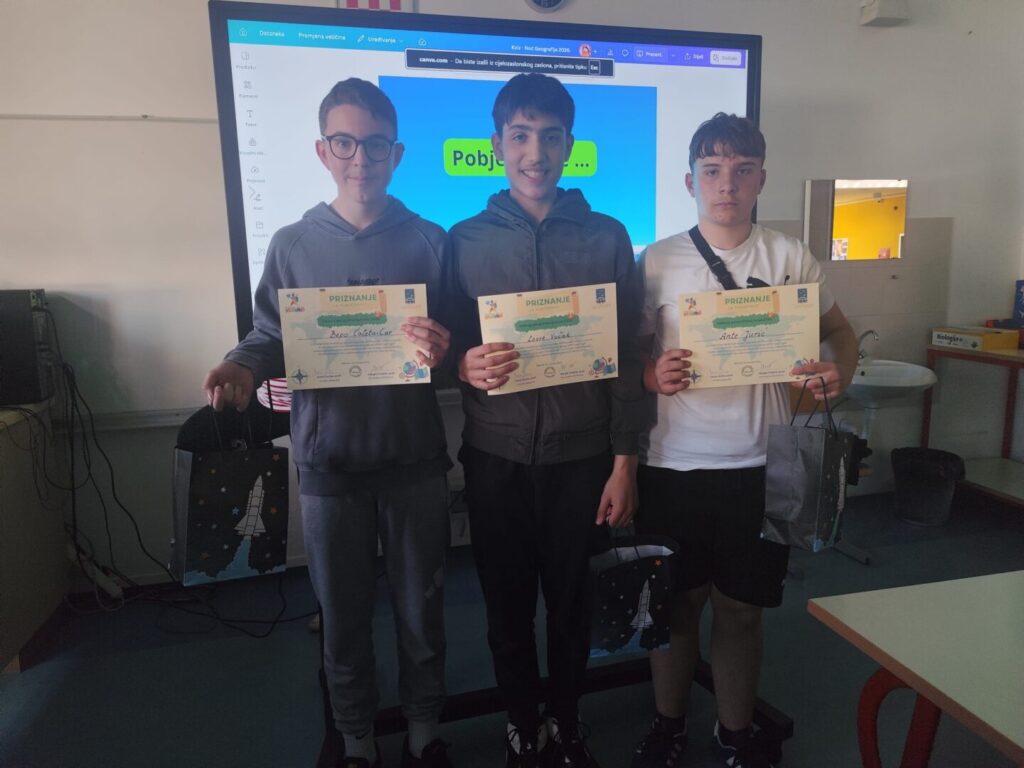 Na kraju su pobjedu odnijeli učenici 8.a razreda, koji su nagrađeni prigodnim poklonima i zahvalnicama. Drugo mjesto osvojio je 8.b razred, treće 7.b razred (dobili su simbolične nagrade). Posebno su se istaknuli Bepo Ćaleta-Car, Lovre Vučak i Ante Jurić, koji su svojim znanjem osigurali svom 8.a razredu pobjedu, ali i nezaboravan izlet brodom na UNESCO-ov spomenik – tvrđavu sv. Nikole u Šibeniku.