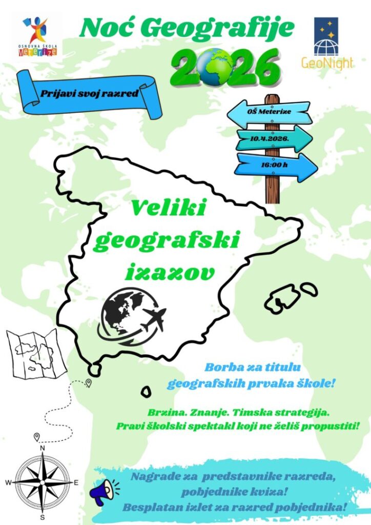 S ponosom objavljujemo da je naša škola i ove godine dio prestižne svjetske manifestacije GeoNight (Noć geografije)! Ono što nas čini posebno ponosnima je činjenica da je Osnovna škola Meterize jedina škola u našoj županiji koja sudjeluje u ovom globalno važnom događaju.