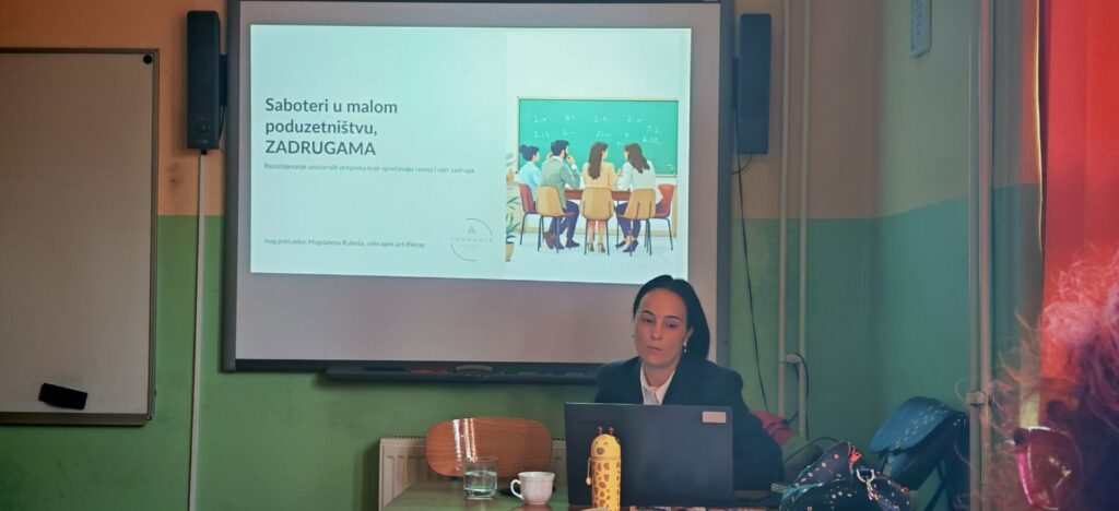 Domaćini su nam predstavili svoju zadrugu, a potom smo svi skupa sudjelovali na radionici i predavanju koju je vodila mag.prim.educ. Magdalena Rubeša, univ.cpec.art.therap. na temu Utjecaj sabotera na male poduzetnike, zadruge.