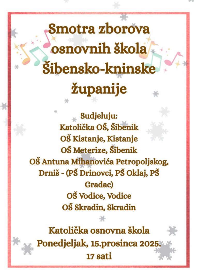 U  dvorani Katoličke osnovne škole u Šibeniku, 15. prosinca 2025. godine  održana je Smotra pjevačkih zborova osnovnih škola Šibensko kninske županije.
